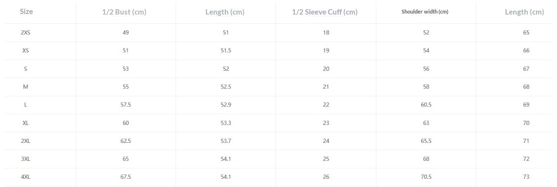 Sizes: 2XS, XS, S, M, L, XL, 2XL, 3XL, 4XL